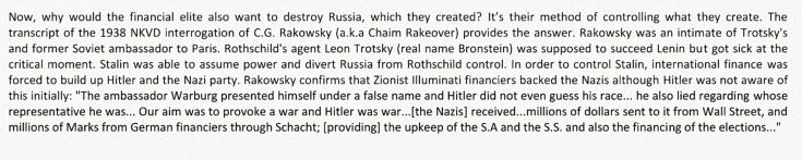 Eşecul extern în a prelua Rusia prin revoluţie devine evident odată cu eşecul facţiunii troţkiste. Aşa că se trece la nivelul următor: Marea Criză Mondială, Al Treilea Reich, al doilea război mondial, Hruşciov, Andropov-Gorbaciov-Elţân(–Putin?)…