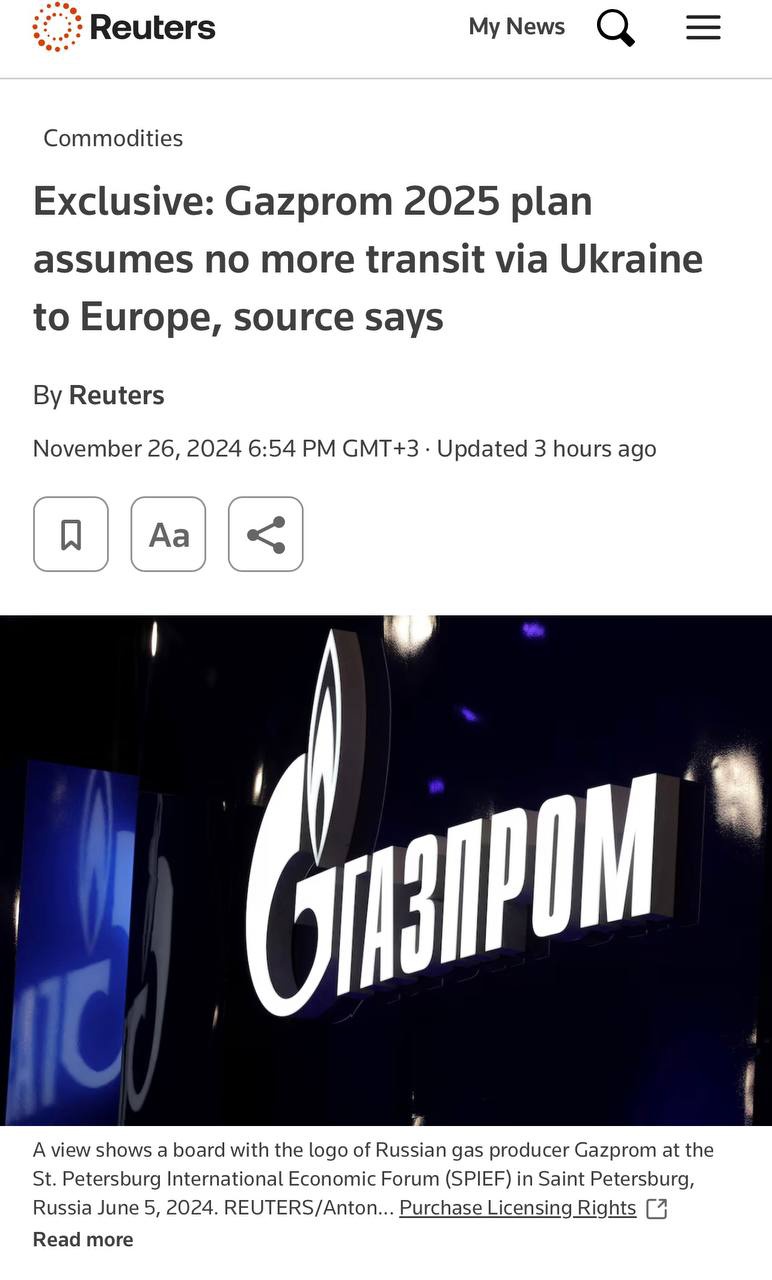 Reuters insider reports that Gazprom’s plans for 2025 do not include any gas transit through Ukraine, and volumes are also decreasing through Turkey to Europe. At the same time, there is an increase in supplies to Asian countries.